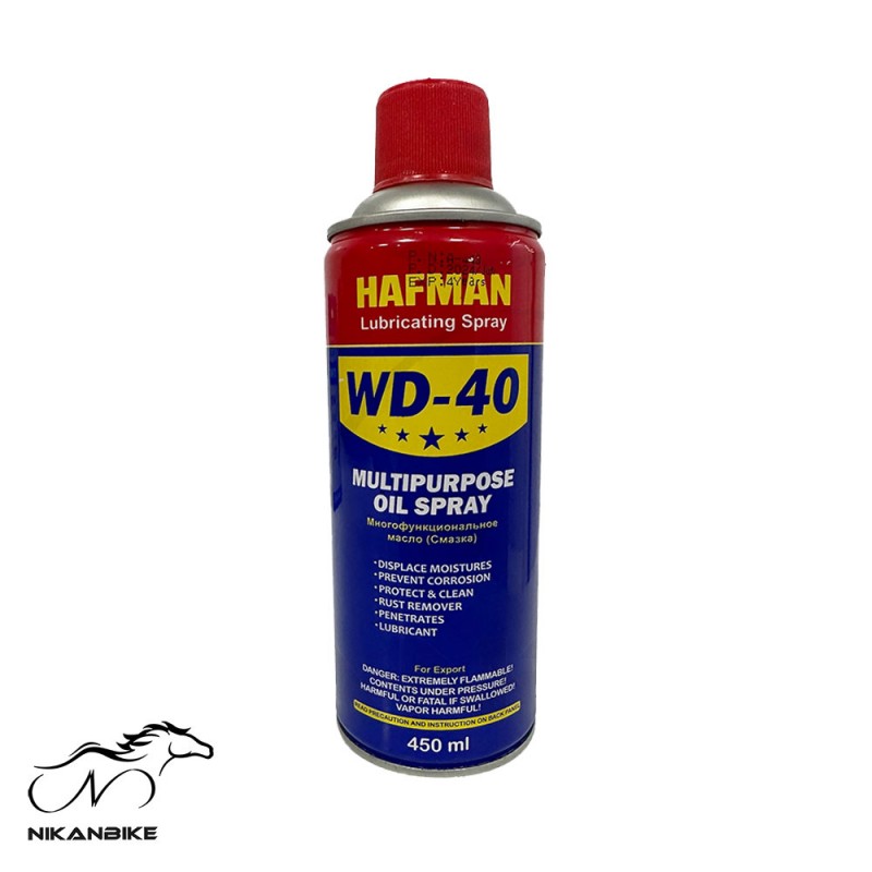 | سایر توضیحات | WD-40 قابل اشتعال است / قابل استفاده به عنوان کپک زدا در صنایع چرم، نساجی و پلاستیک / ضد آب کردن البسه و کفشهای چرمی / از بین بردن رطوبت |