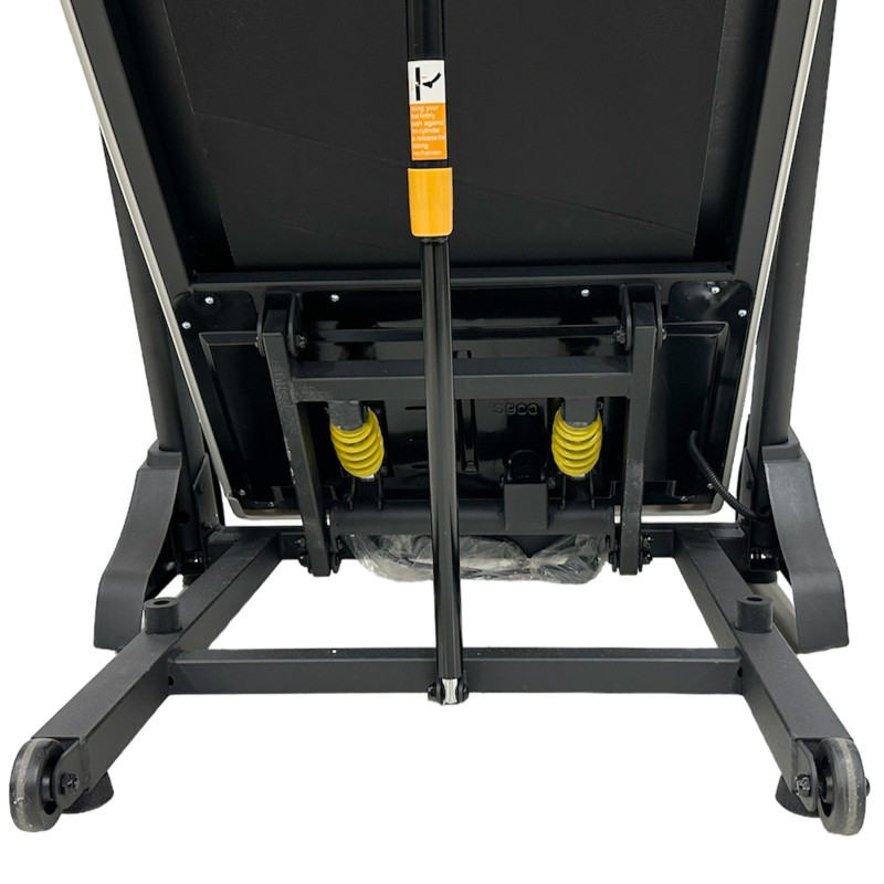 2. تردمیل را از حالت تاشده باز کنید و قفل ایمنی پایه ها را محکم کنید.